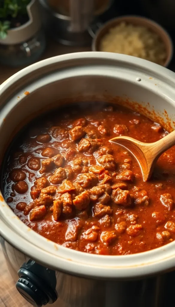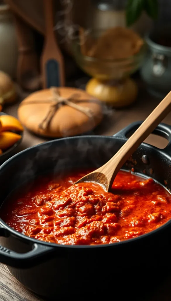 Cook beef with garlic and chili flakes, add tomatoes, and simmer. Perfect for spice lovers.