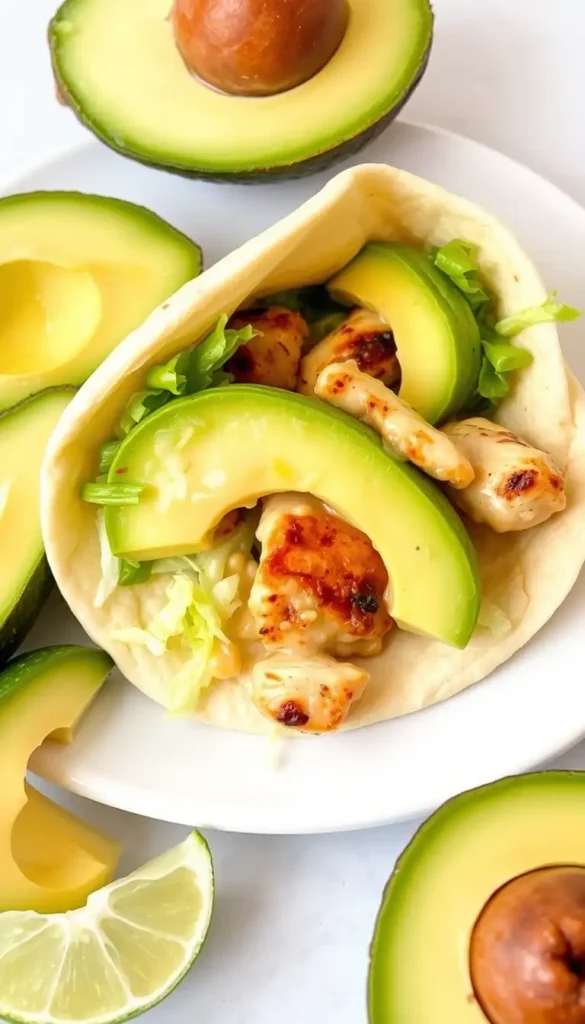 - Layer chicken, cheese, avocado, and lettuce on tortillas.