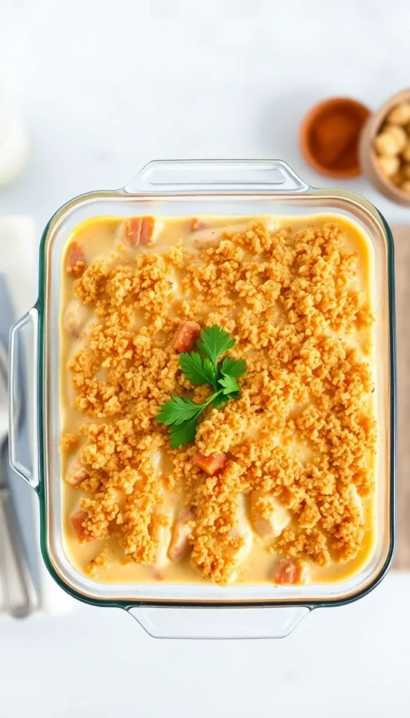 In a small bowl, mix breadcrumbs with melted butter and Parmesan cheese. Sprinkle this mixture evenly over the casserole to create a golden, crunchy topping.