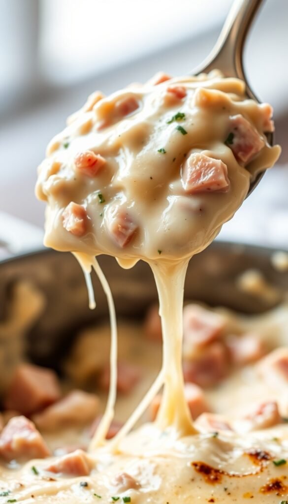 Spread the cooked chicken evenly across the bottom of the casserole dish. Layer the diced ham on top, followed by a generous layer of Swiss cheese.