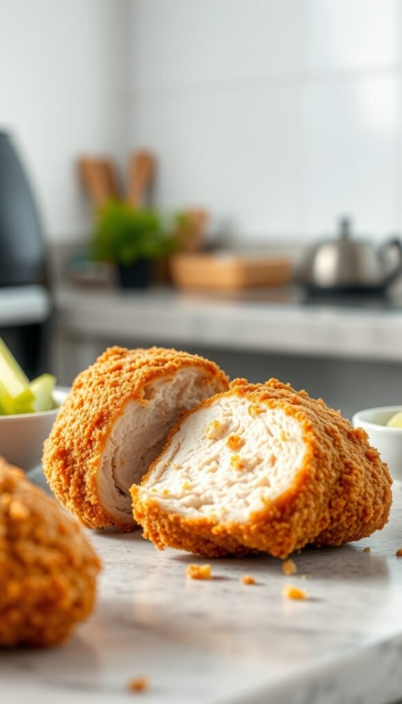 Bread chicken and bake at high heat with a light oil spray for a healthier version.