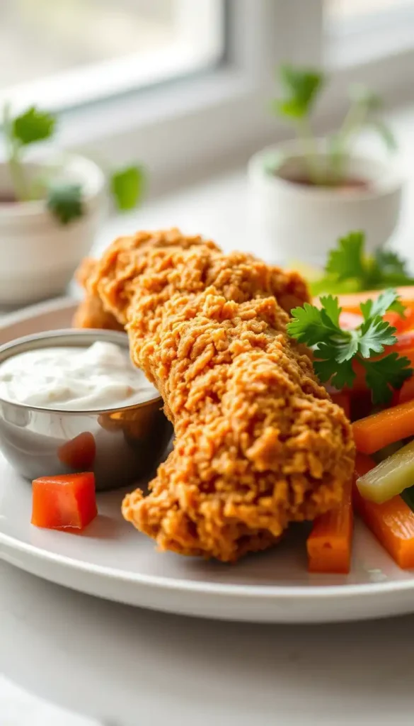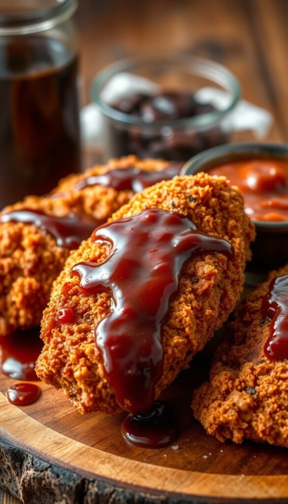 Serve crispy chicken with a tangy barbecue sauce drizzle.