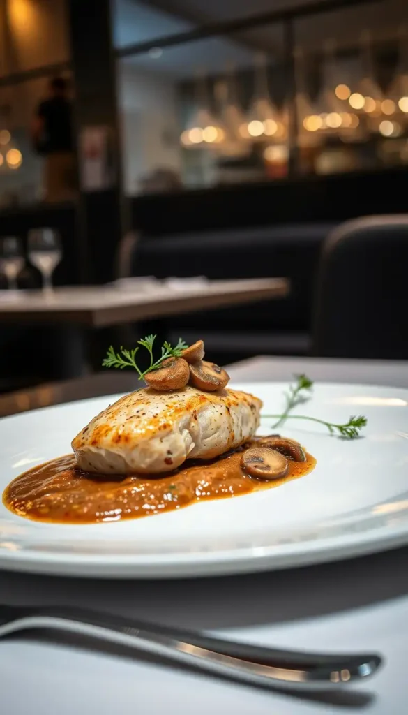 The combination of golden chicken, caramelized mushrooms, and silky wine sauce creates a truly satisfying dish.