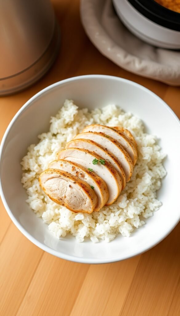 Bake seasoned chicken until juicy and serve sliced over rice.