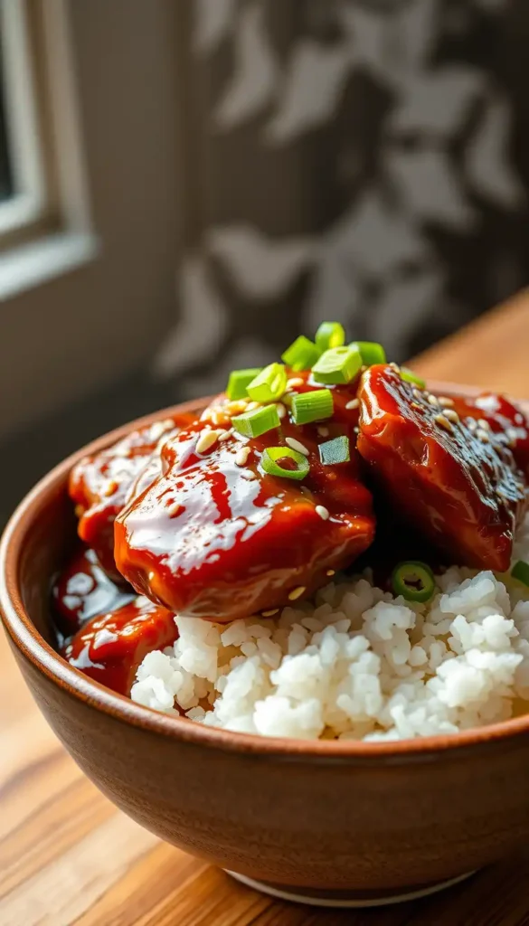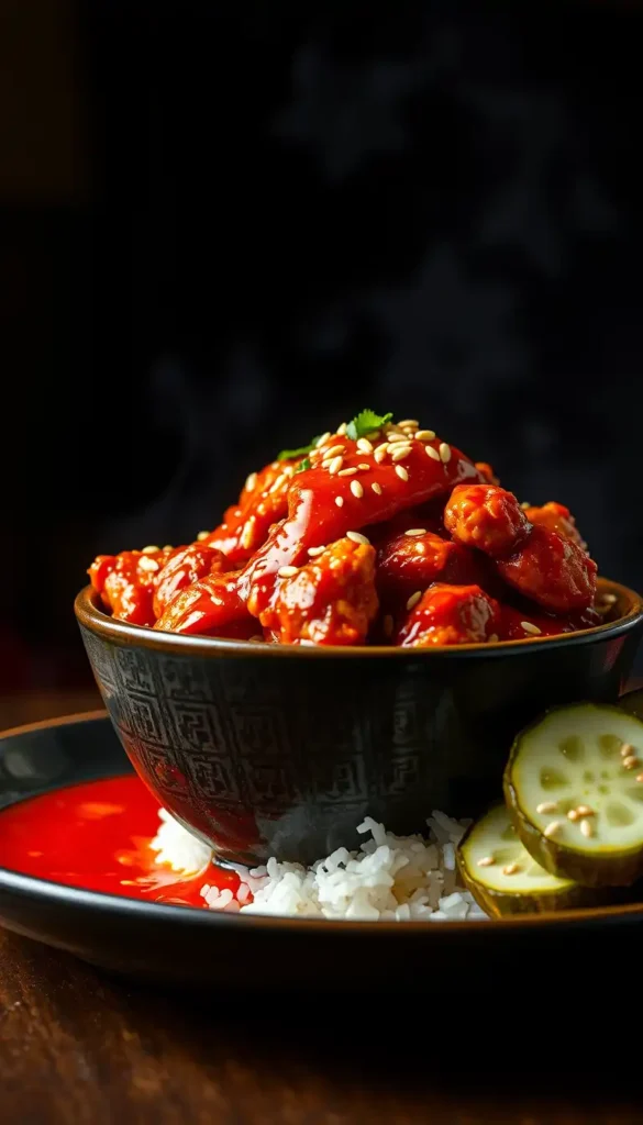 Cook chicken with gochujang sauce until sticky. Spoon over rice and top with pickled cucumbers for balance.