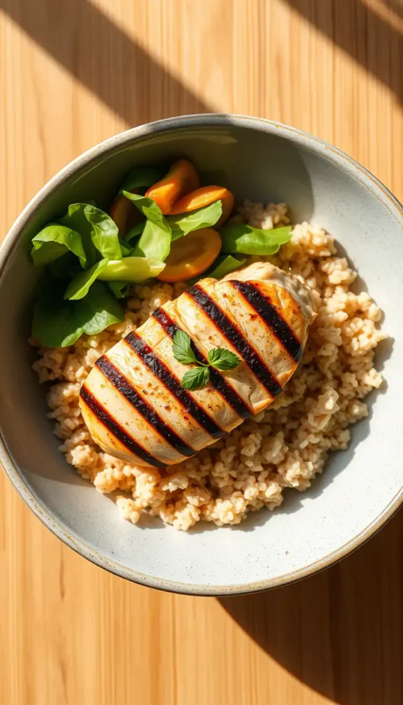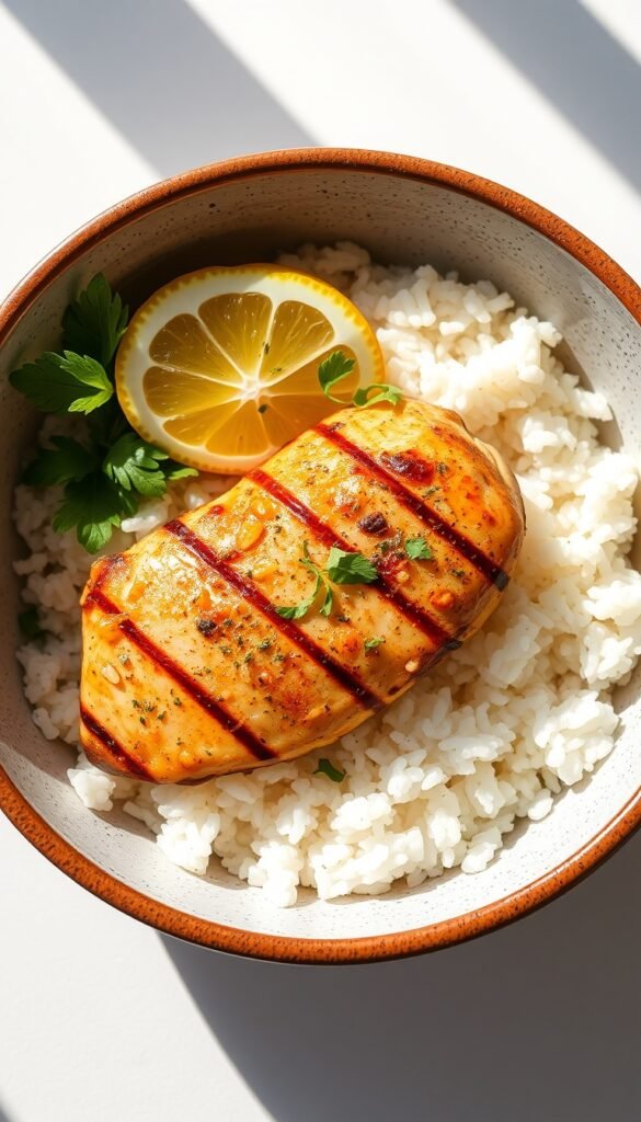 Assemble grilled chicken with rice and vegetables for a clean meal.