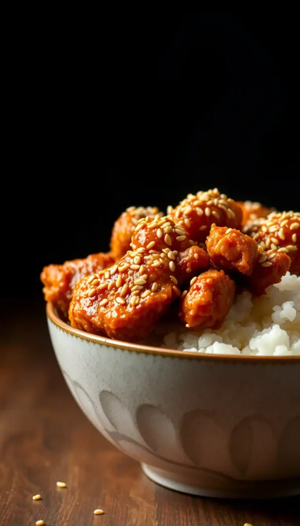 Marinate chicken in soy sauce, honey, garlic, and ginger for 20 minutes. Pan-sear until caramelized. Serve over rice and garnish with sesame seeds and green onions.