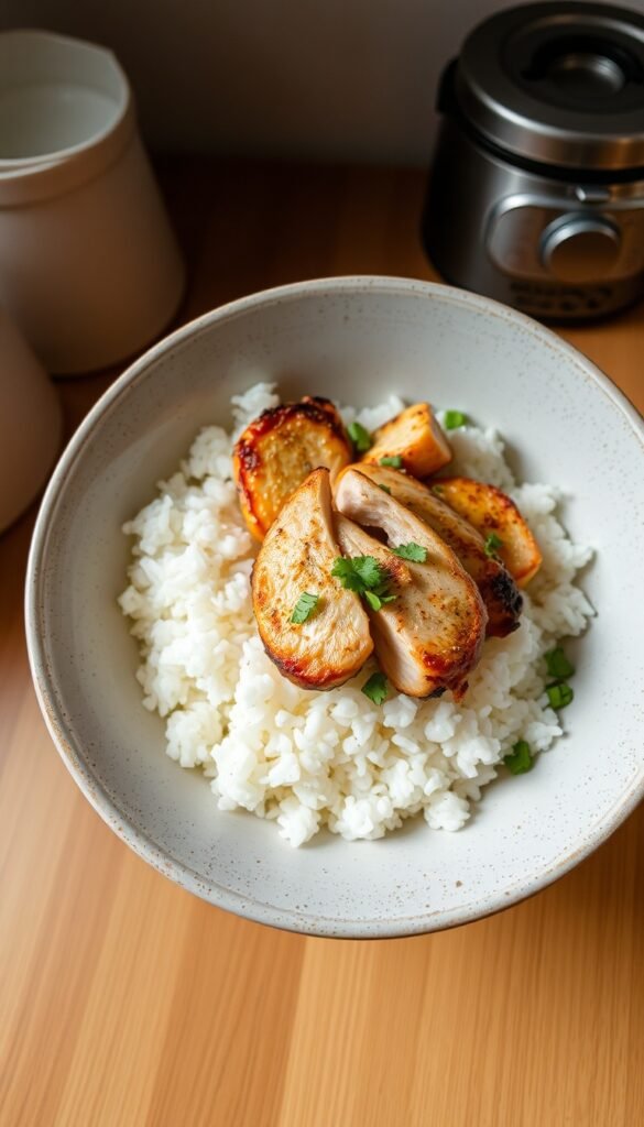 Pan-cook seasoned chicken and serve over warm rice—simple and satisfying.