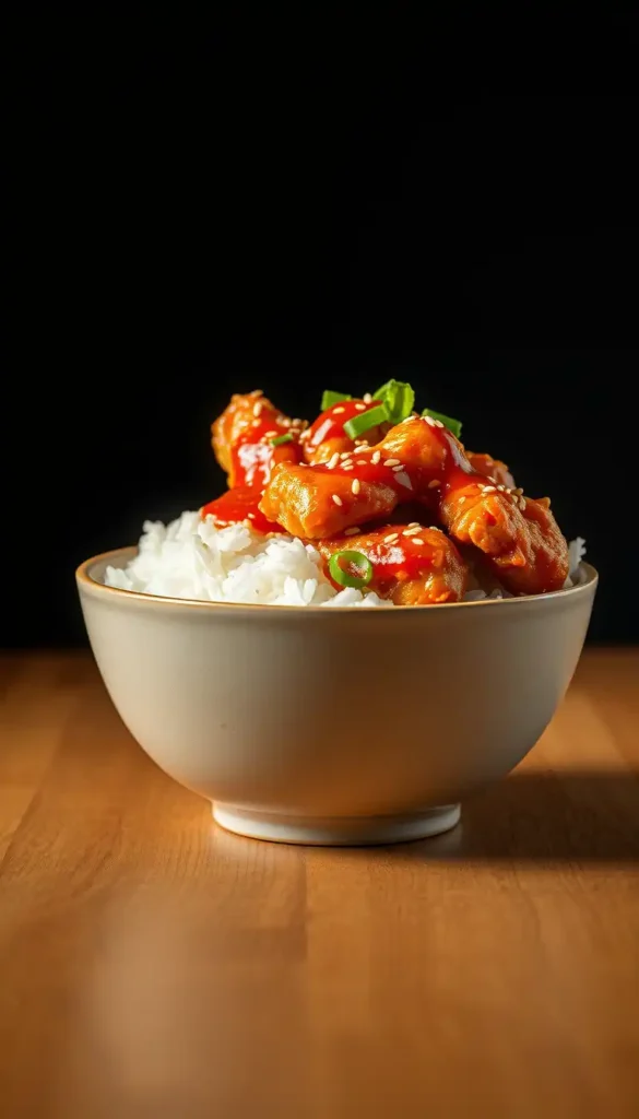 Pan-fry chicken until crispy, glaze with chili sauce, and serve over rice.