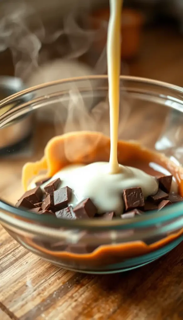 - Pour Over Chocolate: Place chopped chocolate in a heatproof bowl. Pour hot cream over the chocolate and let it sit for 1–2 minutes.