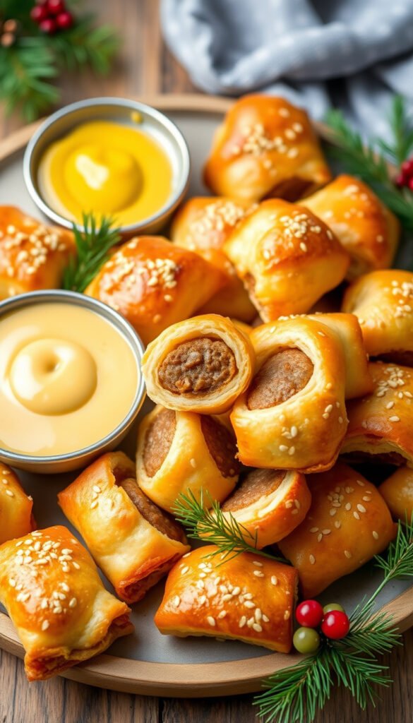 Flaky, buttery sausage rolls paired with honey mustard dip.