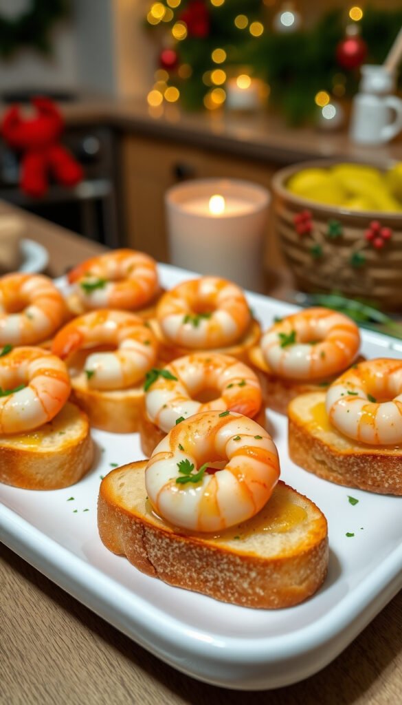 Cooked shrimp tossed in garlic butter and served on toasted baguette slices.