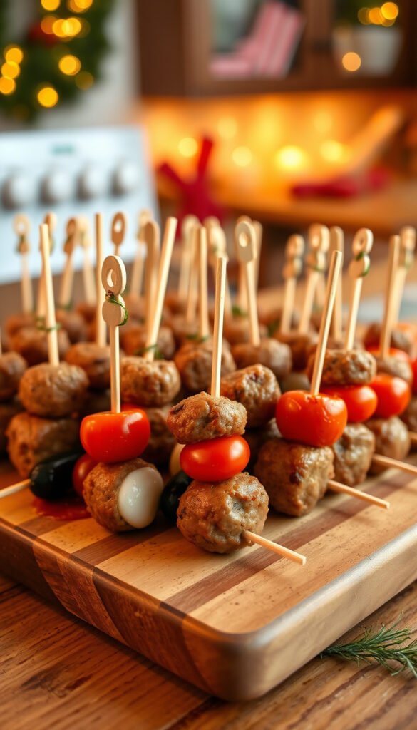 Meatballs, cherry tomatoes, olives, and mozzarella threaded onto cocktail sticks.