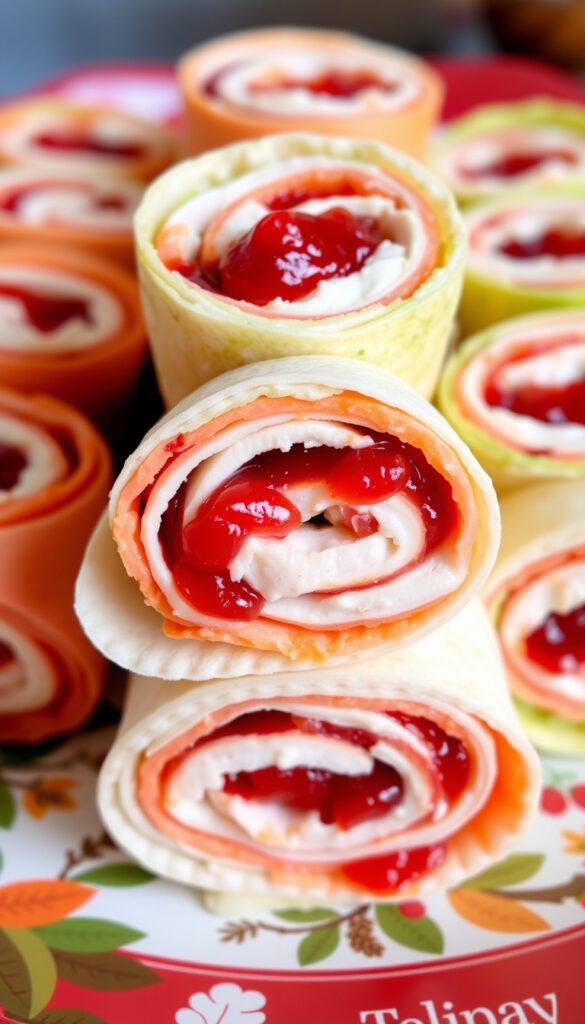 A brilliant way to use leftover turkey! Cream cheese, cranberry sauce, and turkey slices rolled in tortillas and cut into pinwheels.