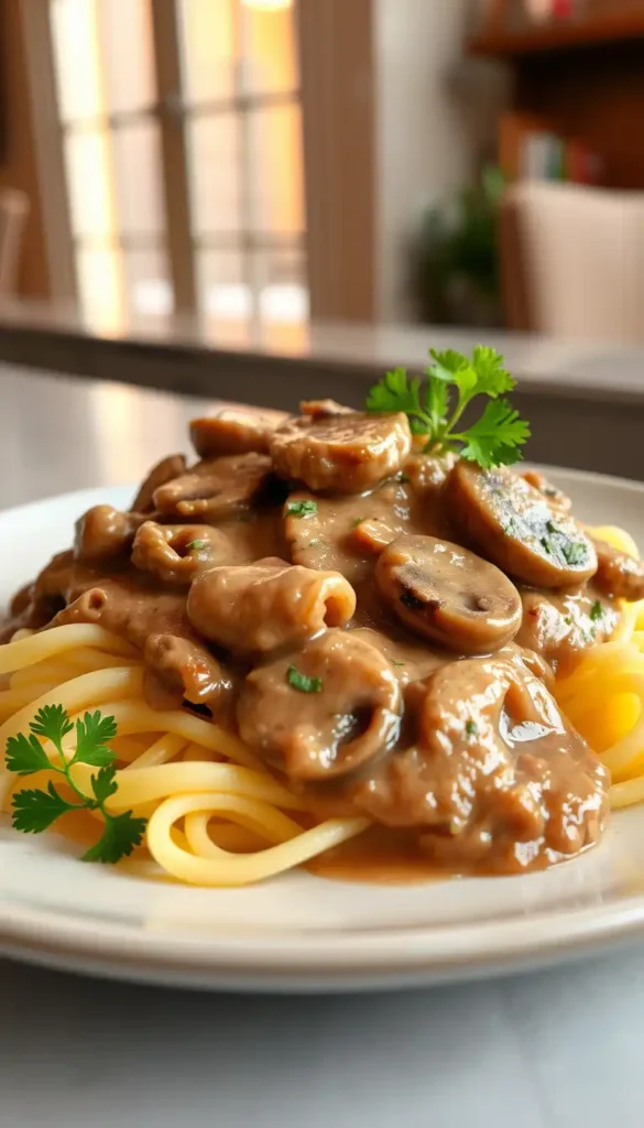 Sauté beef and mushrooms, add sauce, and serve over noodles.