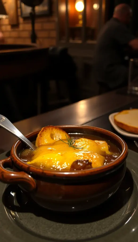 Caramelize onions, add broth, top with bread and cheese, then broil.