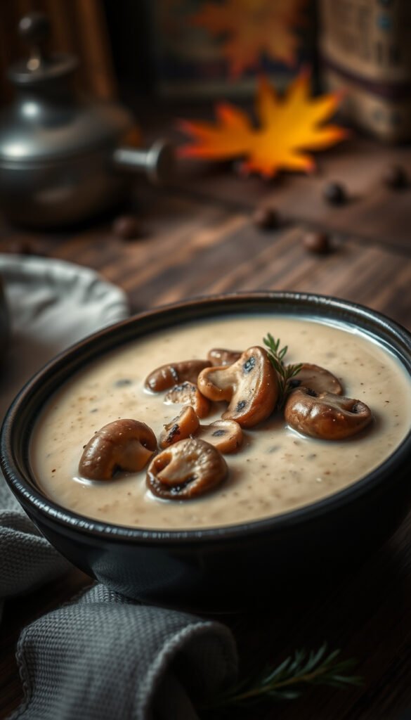 Cook mushrooms until browned, add broth, blend partially, add cream.