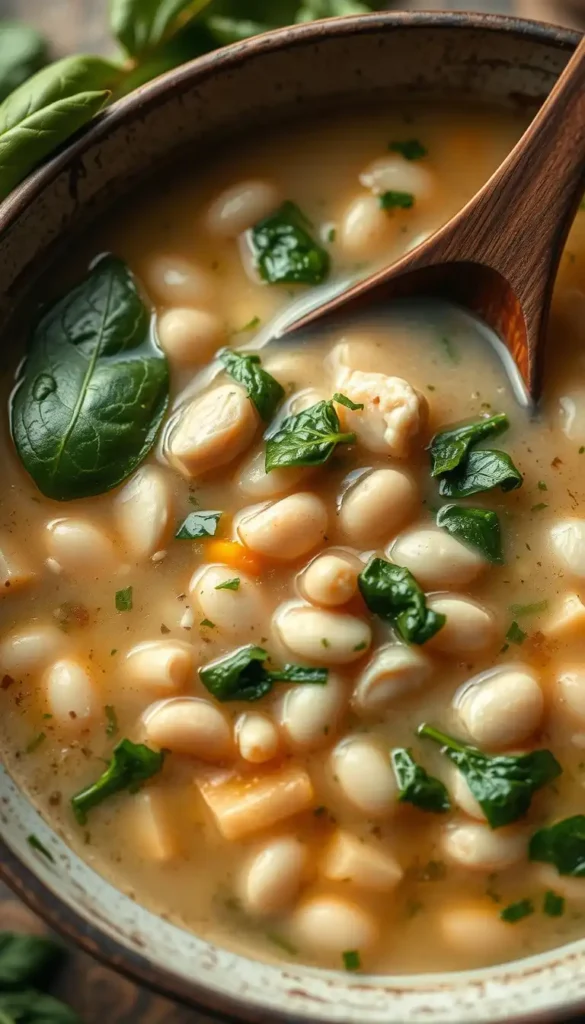 Simmer chicken and beans in broth, stir in spinach before serving.