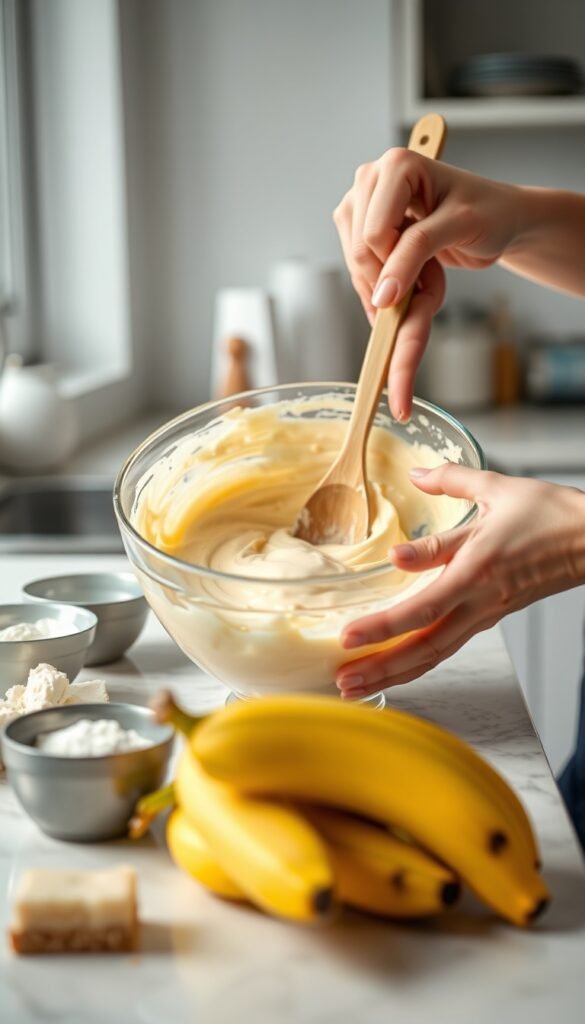 Mix in vanilla extract, banana pudding mix, sour cream, heavy cream, and mashed bananas. Blend until the filling is creamy and lump-free.