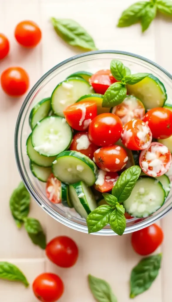 Mix dressing ingredients and gently combine with cucumbers and tomatoes. Serve immediately for freshness.