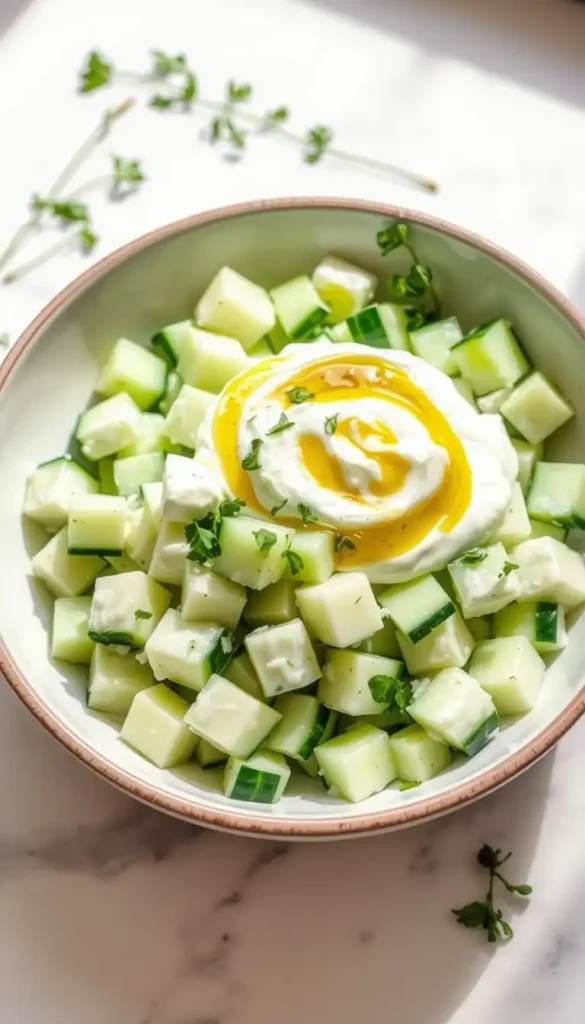 Mix yogurt, garlic, olive oil, and salt. Stir in cucumbers and chill. A healthy, protein-rich option.