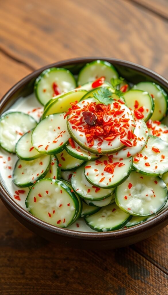 Stir chili flakes into yogurt, toss with cucumbers, and chill.