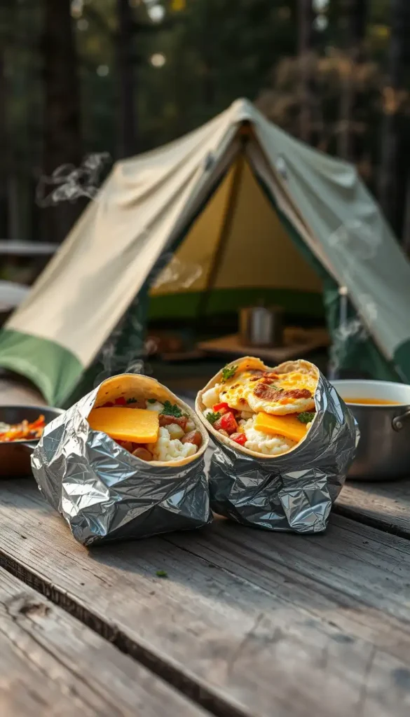 A classic camp meal! Wrap scrambled eggs, cheese, potatoes, onions, and your choice of sausage or vegetables in a tortilla.