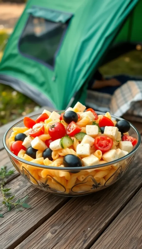 Cooked pasta mixed with cherry tomatoes, olives, cucumbers, cheese cubes, and Italian dressing.