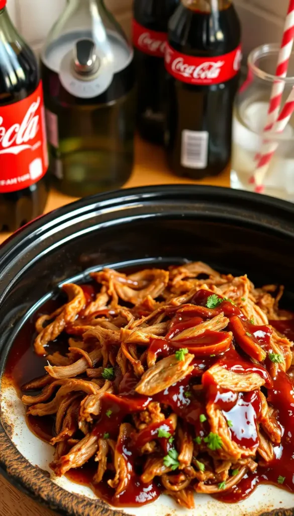 Pour Coke over pork and cook on LOW. Shred, drain excess liquid, then mix with BBQ sauce.
