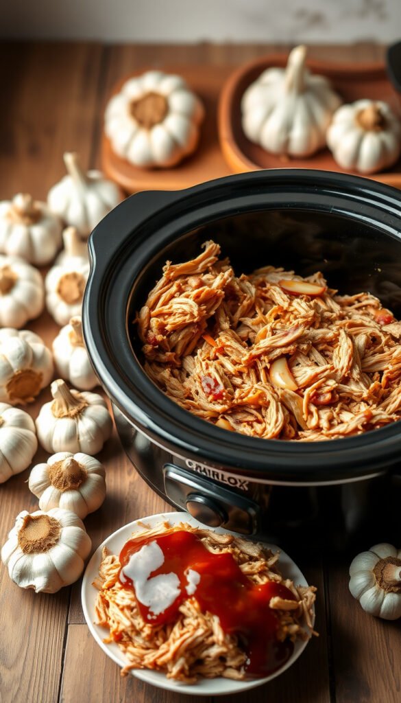 Cook pork with plenty of garlic. Shred and mix with BBQ sauce infused with garlic flavor.