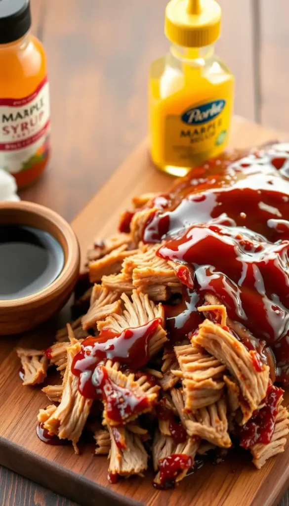 Slow cook pork until tender. Shred and mix with maple syrup, mustard, and BBQ sauce.