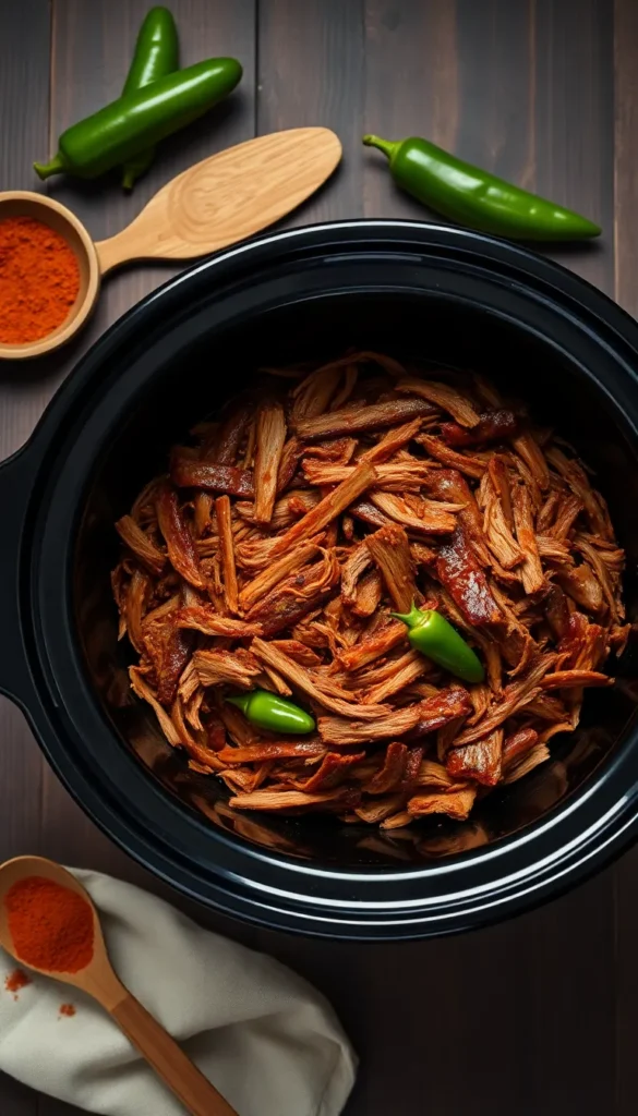 Cook pork with sliced jalapeños. Shred and add BBQ sauce with cayenne for heat lovers.