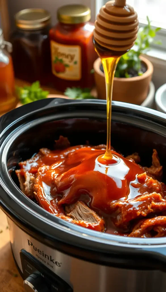 Cook pork with vinegar on LOW for 8 hours. Shred and stir in honey and BBQ sauce for a sweet finish.