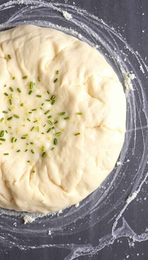 Mix Parmesan and garlic into the dough, knead, and rest until doubled.