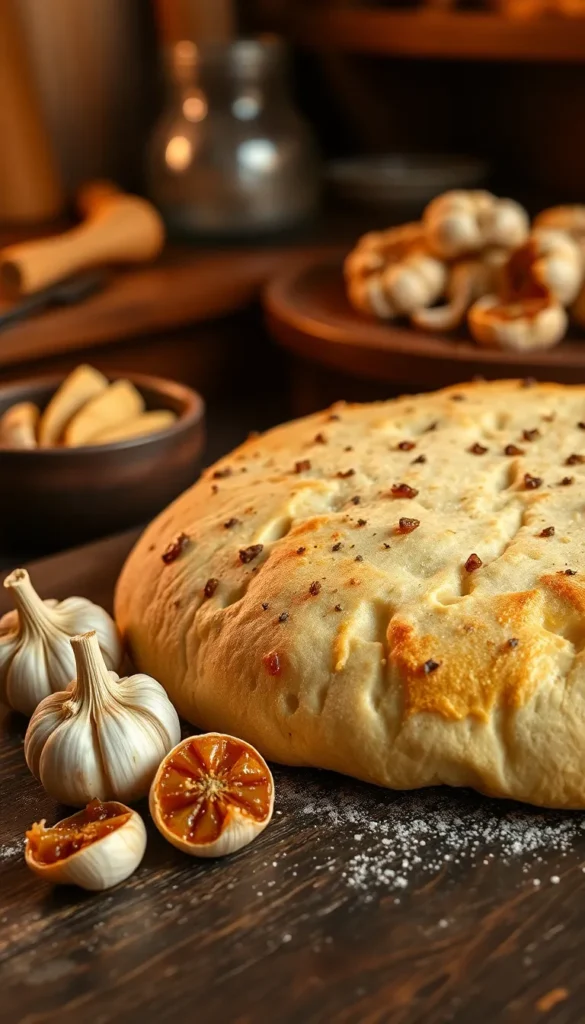 Blend roasted garlic into wet ingredients, combine with flour, knead, and rise for a rich flavor.