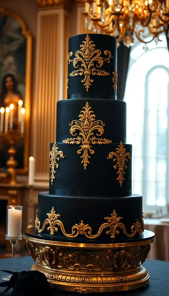 Method: Cover tiers in black fondant; decorate with gold baroque appliqués.