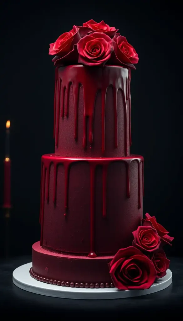 Method: Bake deep-red layers; frost white; add blood-red chocolate drip.