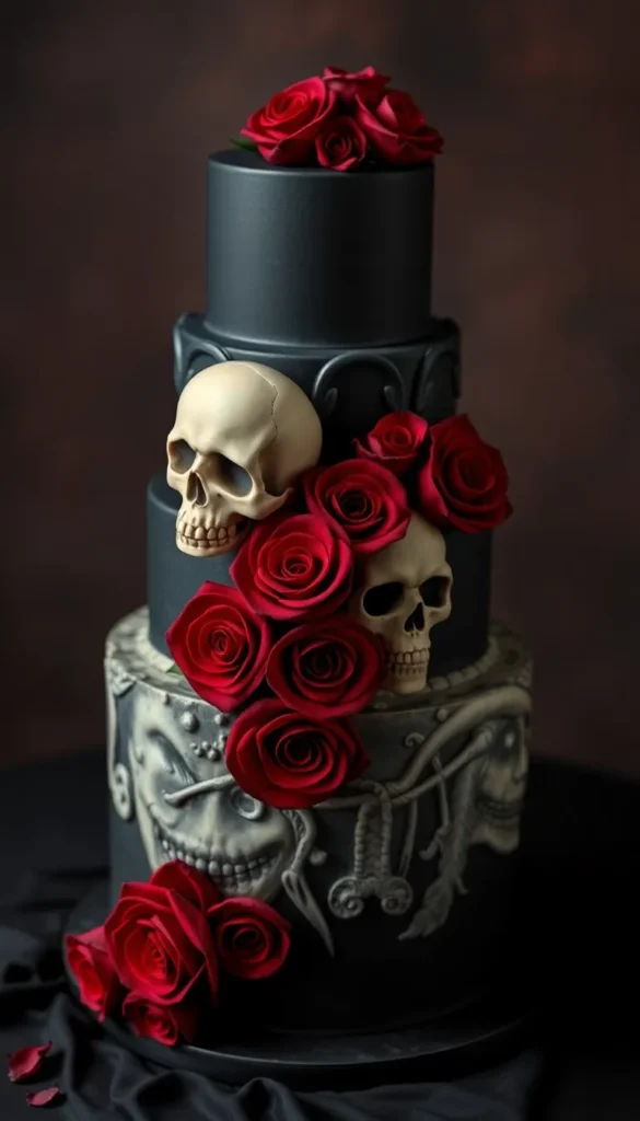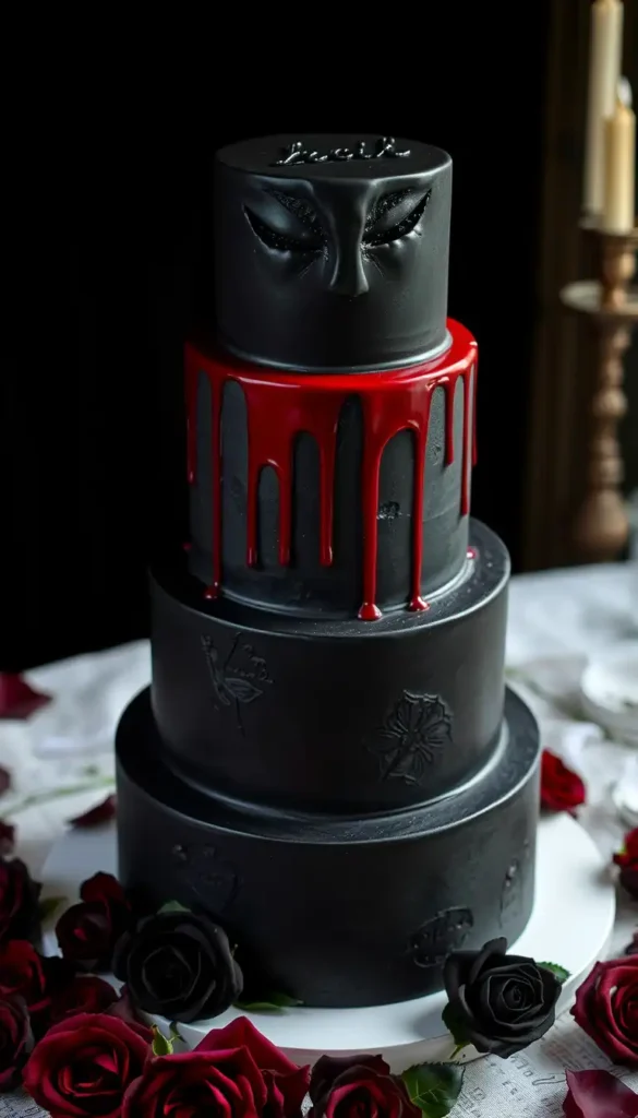 If your wedding theme includes dark romance, vintage Gothic, witchcore, vampire aesthetics, or old-world elegance, these cake ideas will fit perfectly.