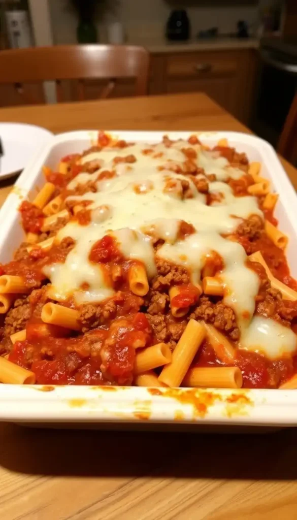 All the flavors of lasagna without the layering. Combine pasta with ricotta, marinara, beef, and cheese. Bake until golden and bubbly.