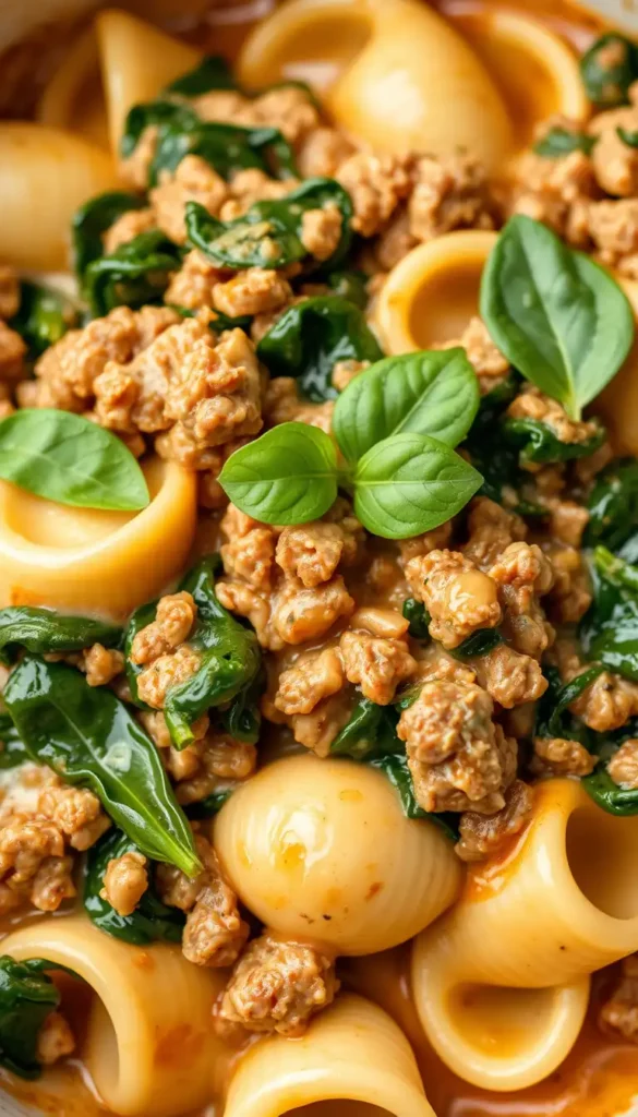 Shell pasta coated in a creamy sauce with wilted spinach and seasoned ground beef. Balanced, delicious, and easy.