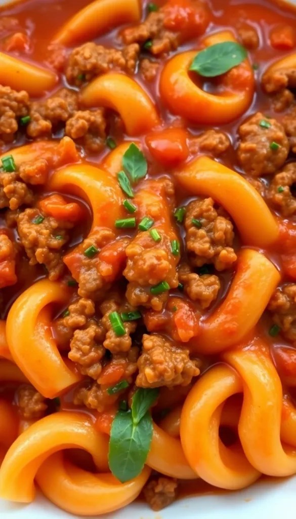 A mix of tomato sauce and cream with seasoned ground beef. Rich, velvety, and perfect with rotini or bow-tie pasta.