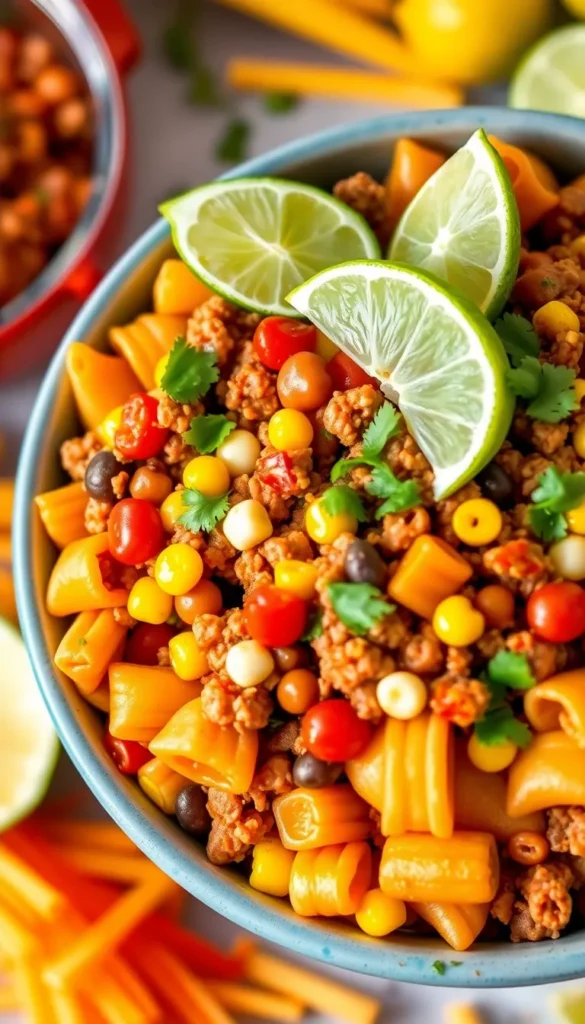 Season ground beef with taco seasoning, add corn, beans, salsa, and pasta shells. Top with cheddar, cilantro, and a squeeze of lime.