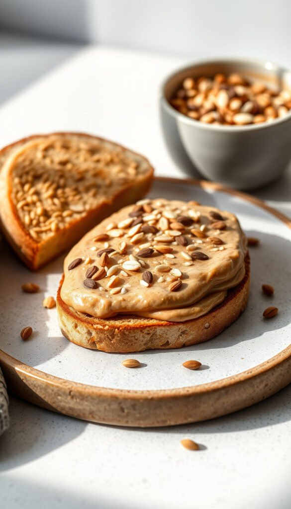 - Spread almond butter and top with seeds.