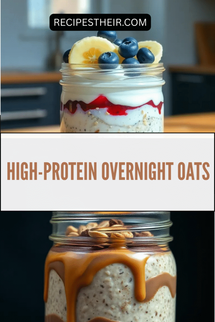 High-Protein Overnight Oats are a no-cook oatmeal recipe made by soaking oats in liquid overnight, combined with protein-rich ingredients such as Greek yogurt, protein powder, milk, nuts, or seeds.