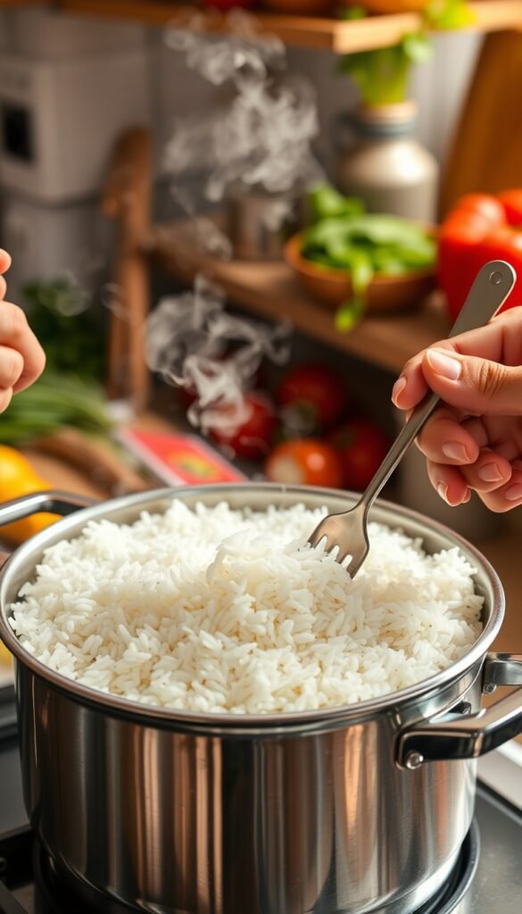 Use a fork—not a spoon—to gently fluff the rice and separate the grains.