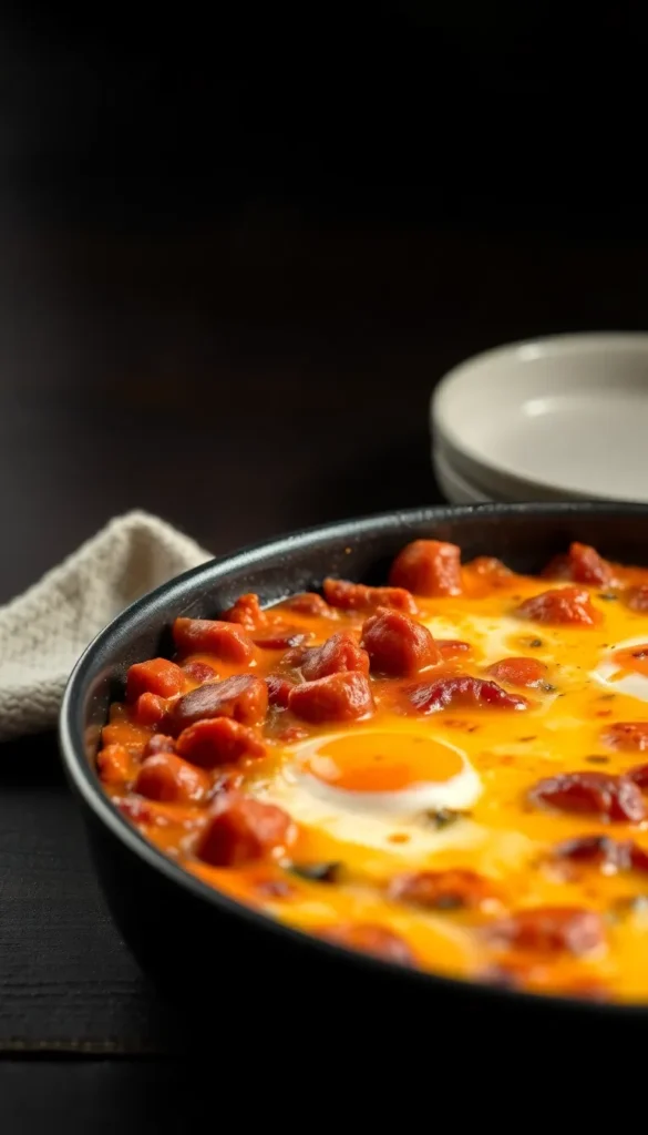 Cook chorizo, mix with eggs and cheese, and bake for 35–40 minutes.