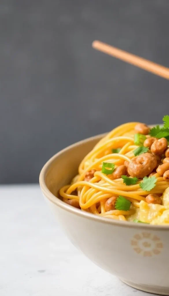 A flavorful dinner using pre-cooked noodles and creamy peanut sauce.