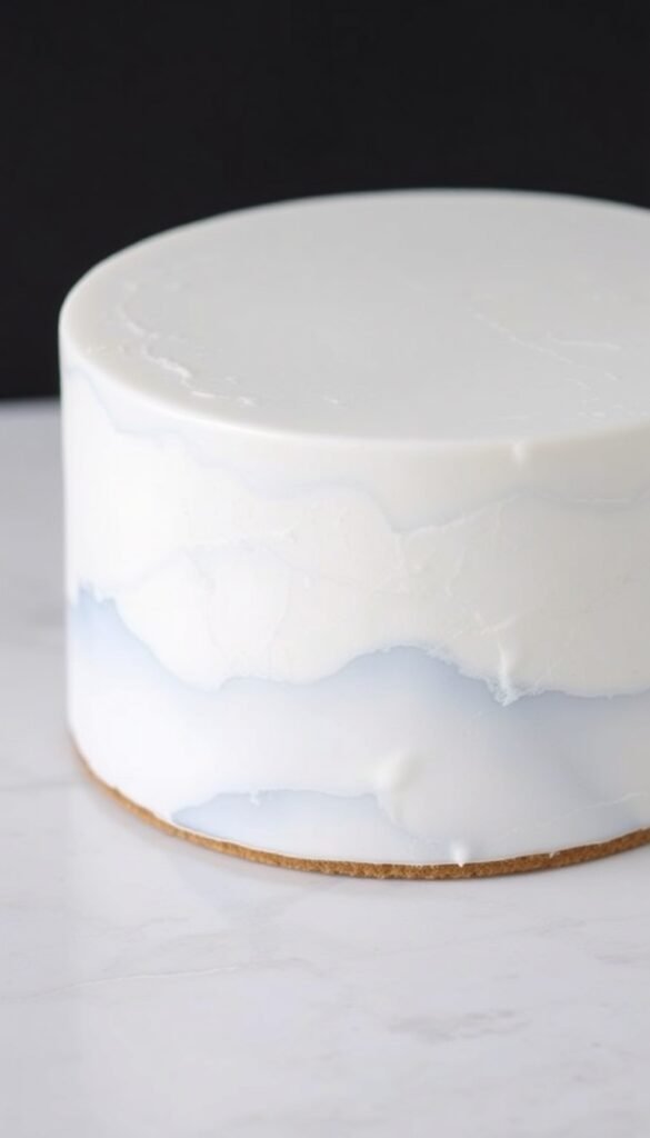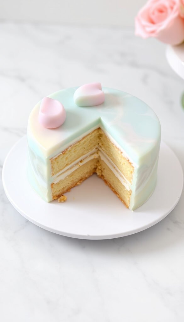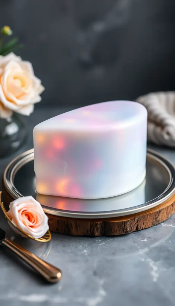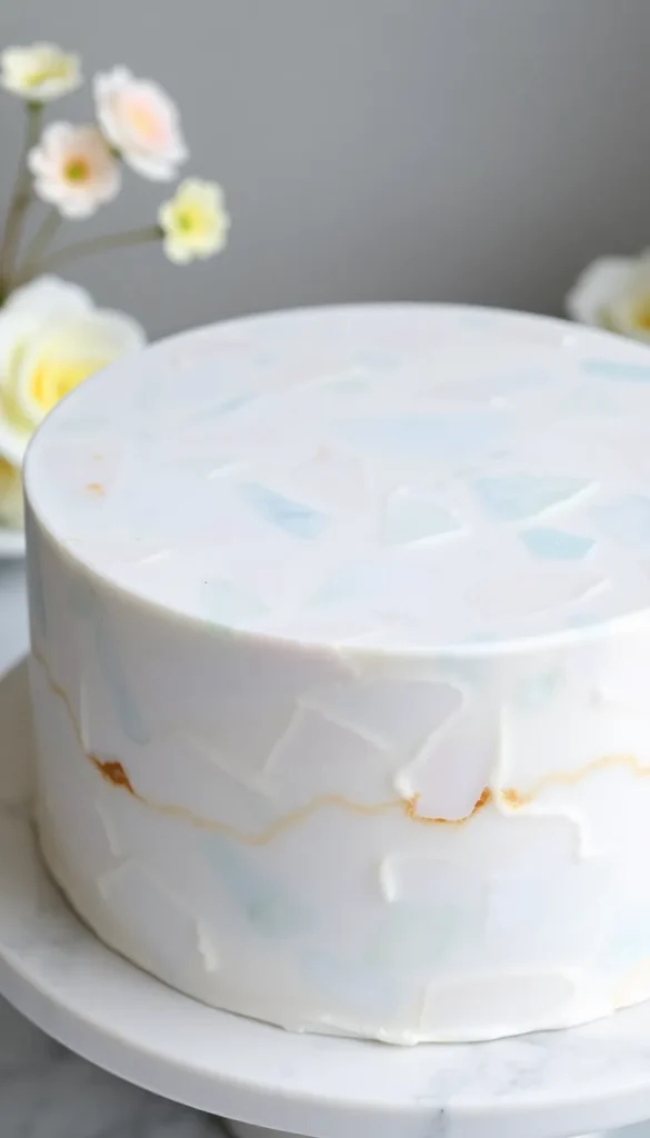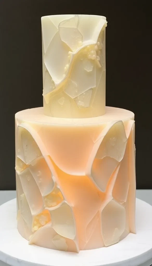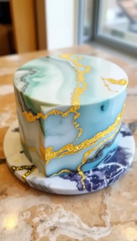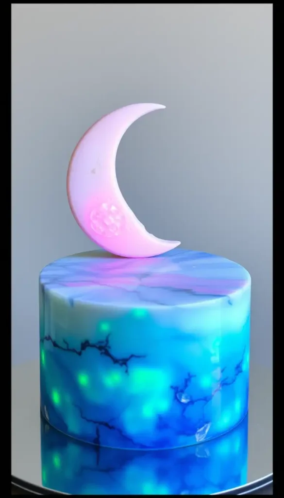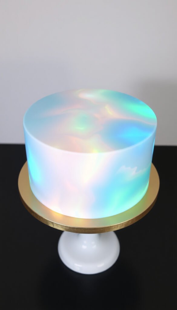 Using mirror glaze or glossy fondant, this cake looks like polished opalite stone and reflects ambient light beautifully.