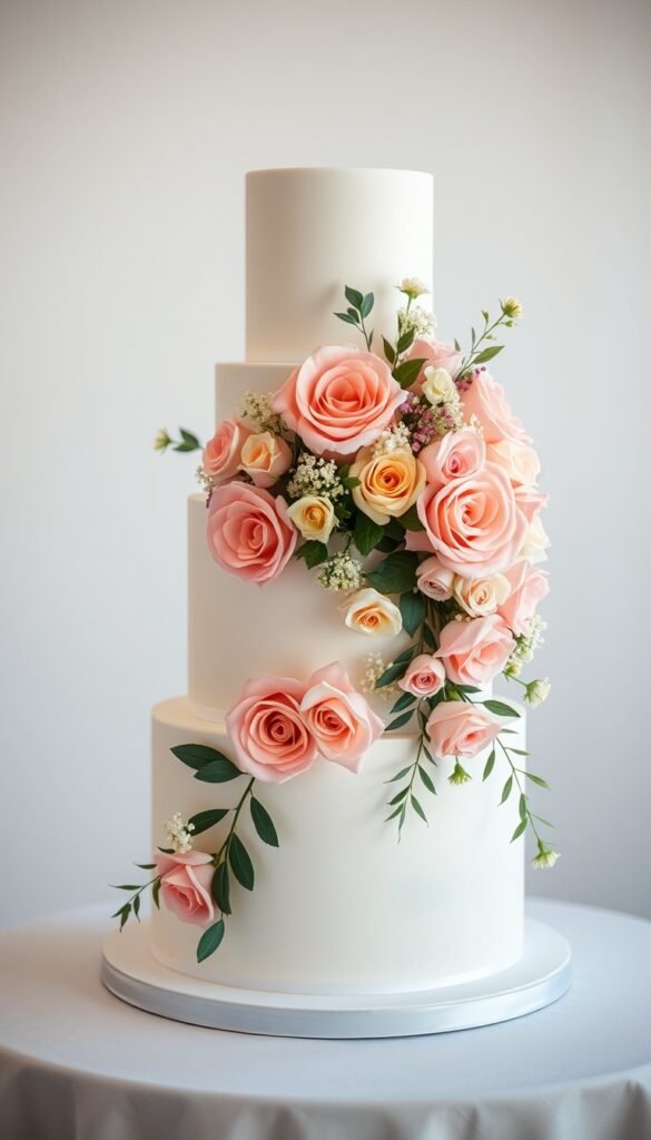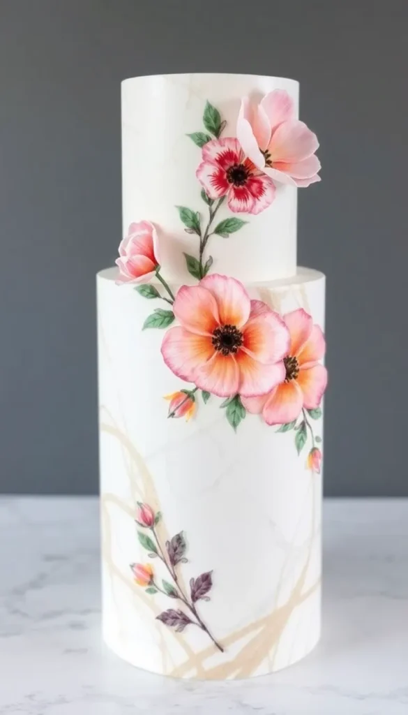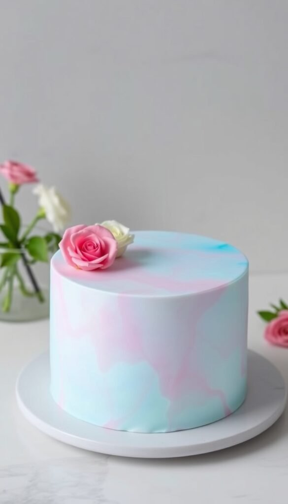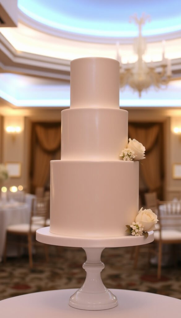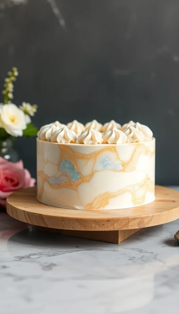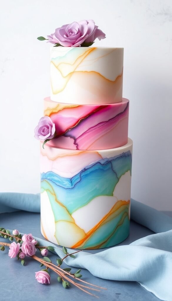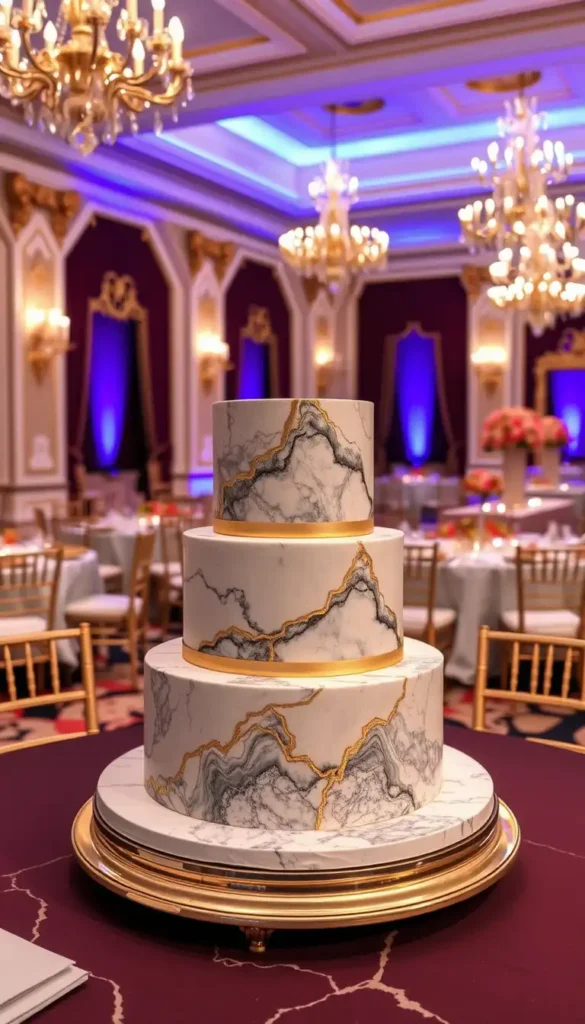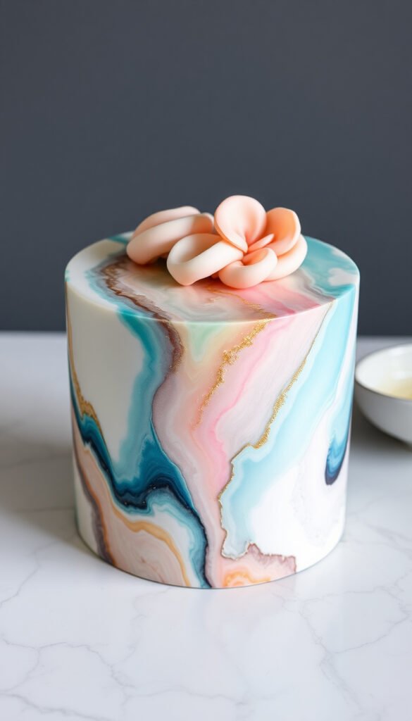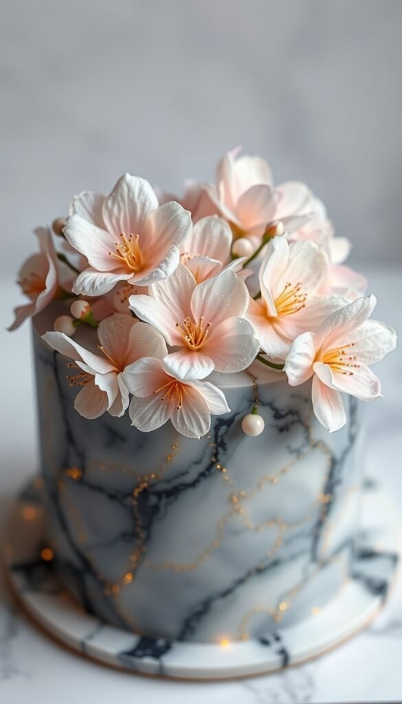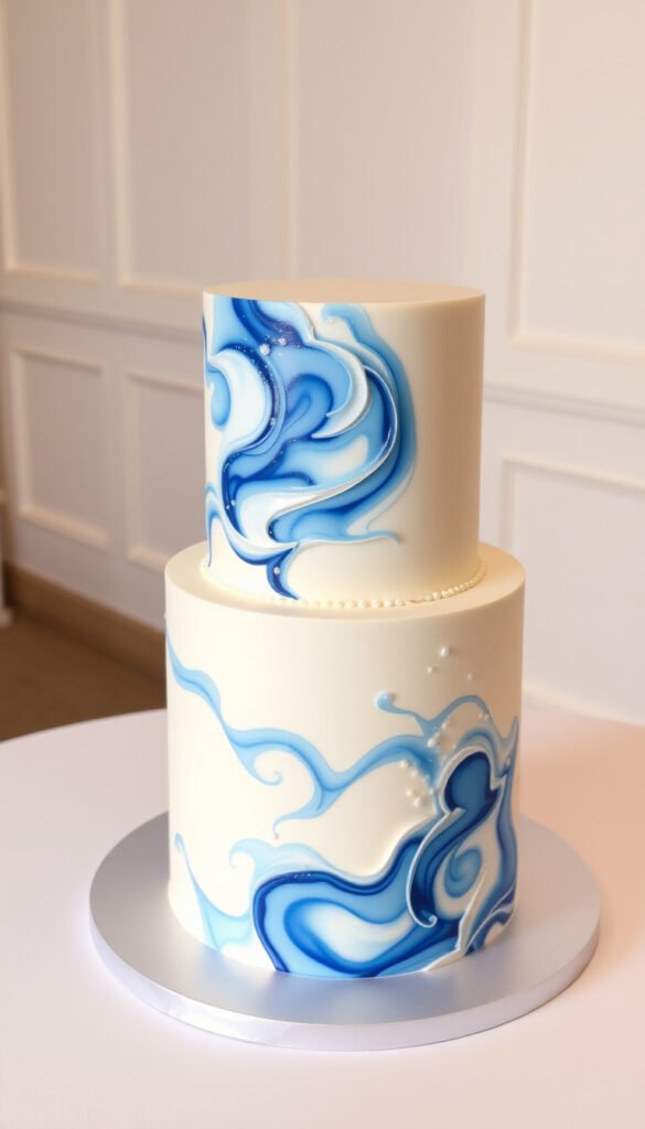 This design mixes cream, white, and pearl fondant into a subtle marble pattern. It’s understated yet luxurious and works beautifully for traditional wedding themes.