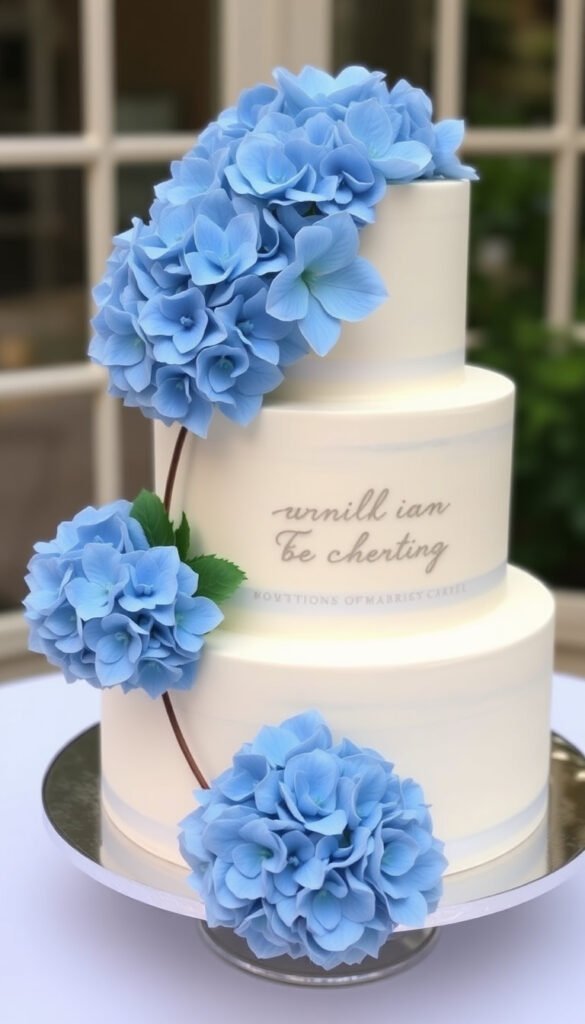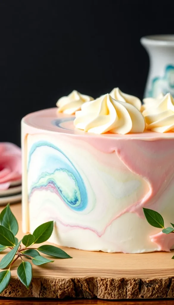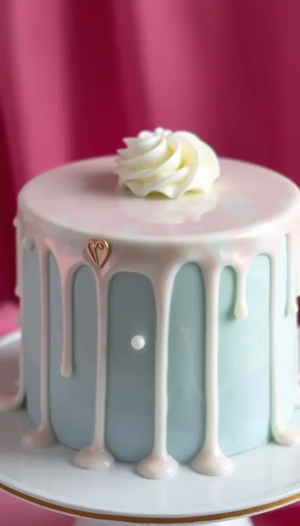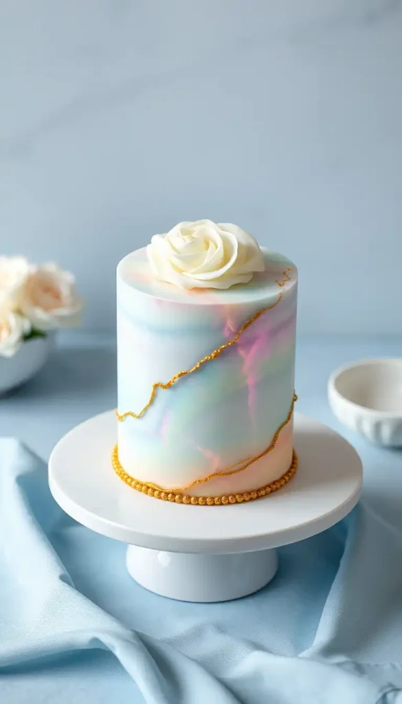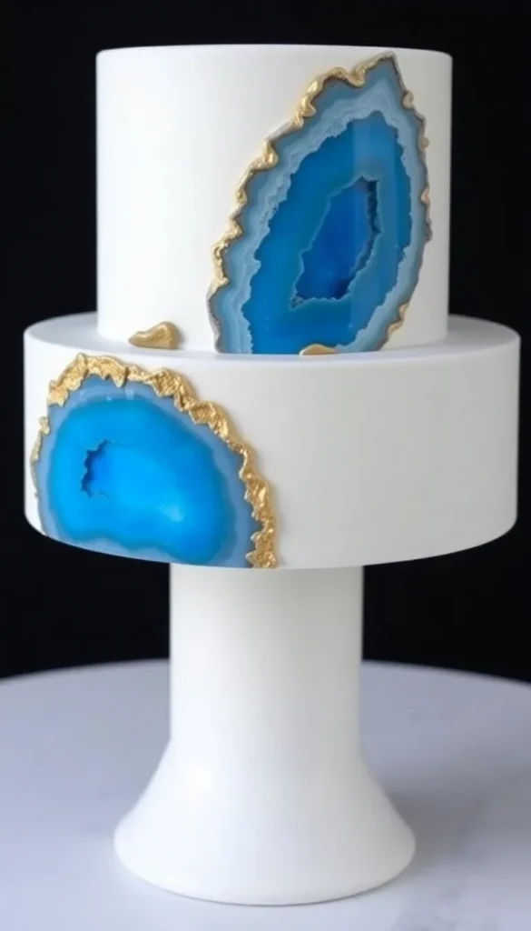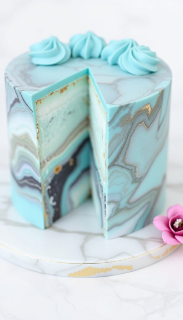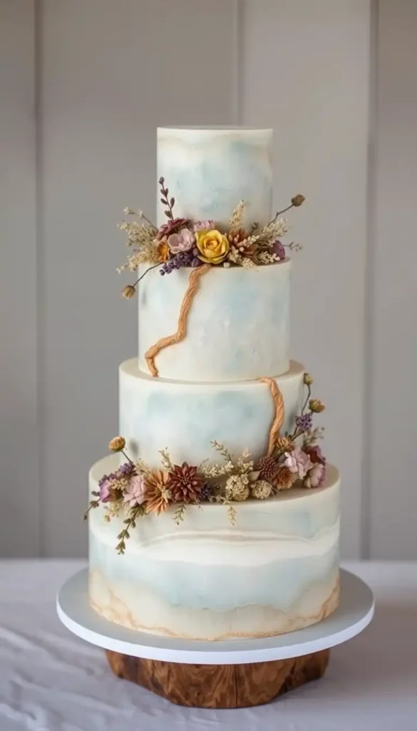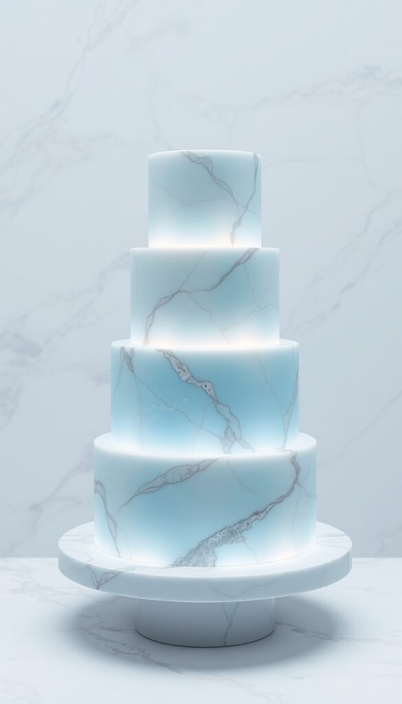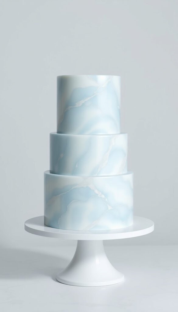 This cake blends soft blues and whites using a swirl technique that resembles opalite’s cloudy interior. It is perfect for ocean, beach, or crystal-inspired weddings.